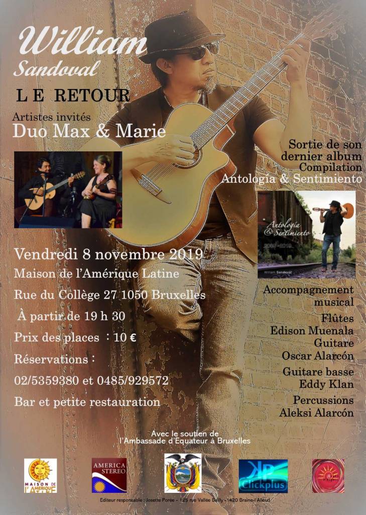 En 25 années de carrière artistique, William Sandoval a réalisé plusieurs CD avec Saramarka, un groupe d’origine équatorienne. En tant qu’auteur-compositeur-interprète, il a produit trois CD, dont les thèmes, dans leur ensemble, dénoncent les problèmes sociaux et les conséquences de la migration. Plusieurs d’entre eux ont fait l’objet de prix et reconnaissance tant en Equateur qu’en Belgique.
